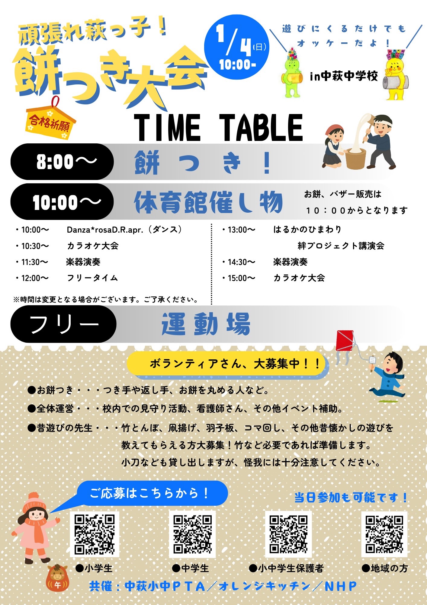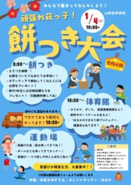 8:00~ 餅つき 10:00~ 体育館催し物、お餅・バザー販売開始 フリー 運動場 【ボランティア募集】※高校生以上 お餅つき・全体運営・昔遊びの先生