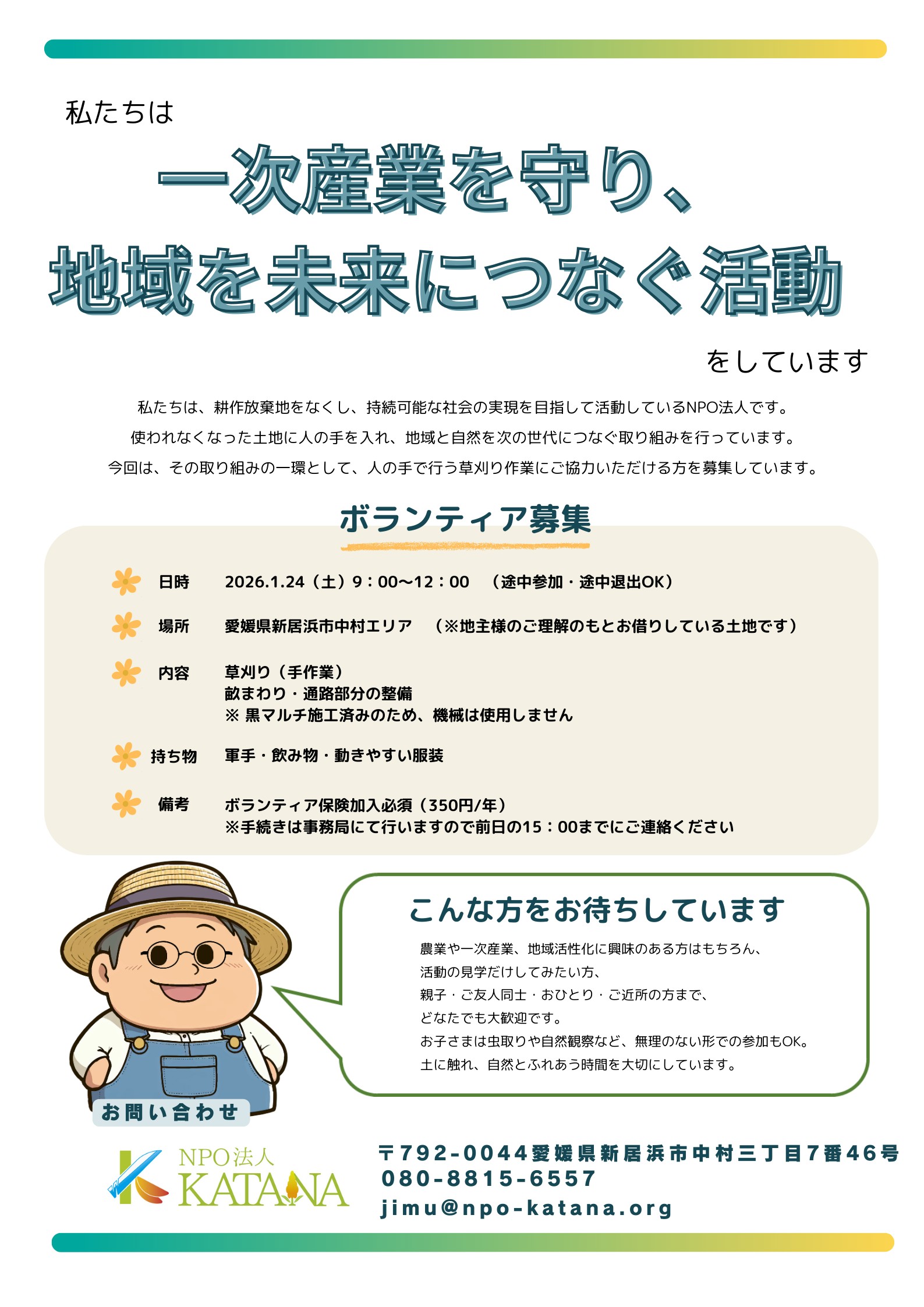 電話かメールでお申込みください。 ↓ 【申込先】 NPO法人刀 TEL:080-8815-6557 メール: jimu@npo-katana.org