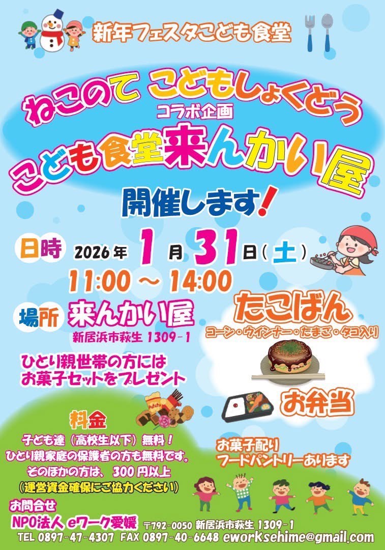 | 内容 | こども食堂来んかい屋を開催いたします。 今回はねこのてこどもしょくどうさんとのコラボ企画です。 たこばん(コーン・ウインナー・たまご・タコ入り)、お弁当の配布等行います。ひとり親世帯の方にはお菓子セットをプレゼント お菓子配り、フードパントリーあります |
