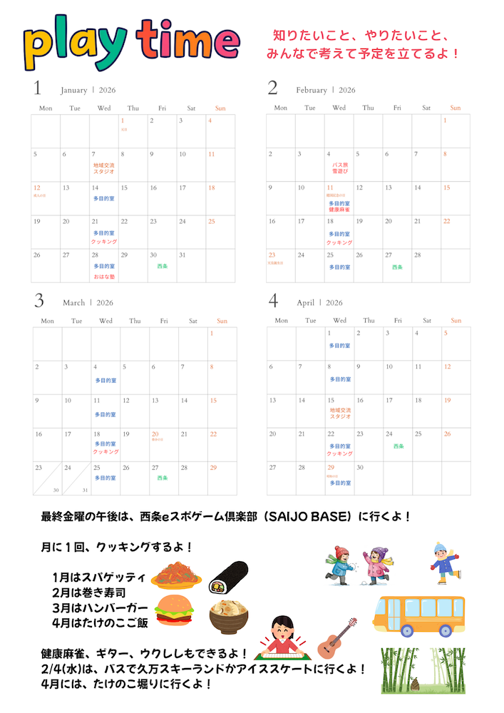 内容:eスポーツ、YouTube、鬼ごっこ、サッカー、ドッチビー、ギター、クッキング、健康麻雀、アナログゲーム、親はフリートークなど